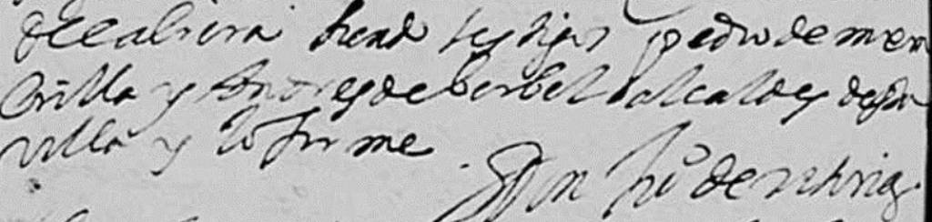 A doce días del mes de agosto de mil setecientos y siete años, se enterró en la iglesia parroquial de la villa de Huéneja a Doña Ana Berbel viuda de Don Antonio Chacón. Recibió los Santos Sacramentos y hizo testamento ante Juan Molina notario apostólico, y por él mandó que se le dieran por su alma y por su salvación ciento y cincuenta y una misas rezadas. Con esta particularidad, que la una se haga en altar privilegiado, las cincuenta se hagan en el convento de los padres capuchinos en la ciudad de Granada, y las otras cincuenta, que precisamente las diga Don Lorenzo Berbel monje trinitario su sobrino y las cincuenta restantes la parroquia de esta villa = Asimismo declaró deber una manda, que hizo en la Iglesia de la Piedad de Baza, que fue el perdón amigo? a su hijo Don Joseph Chacón, y darlo en limosna a la Iglesia y que por no haberlo ejecutado, manda hacerlo así y que el dicho hijo sea obligado a llevarlo y a hacer la peregrinación = Asimismo mando a Doña Claudia Berbel, su sobrina, por cargo en servicio y parentesco cinco ducados = Asimismo a Manuel López Portero le mando…cinco ducados por cargo a su trabajo personal = Asimismo mandase dijere una misa en los Santos Mártires…..= Asimismo mando a la cofradía del santísimo sacramento seis reales en limosna y a las demás que se sirven en esta villa, cuatro reales a cada una = A las mandas forzosas un real a cada una = Nombró por sus albaceas a Don Antonio Berbel (su hermano) y al licenciado Don Pedro de Frías, todos vecinos de esta dicha villa. Enterrose en sepultura y a la fábrica tocanle catorce reales, y para que conste lo firmé Licenciado Don Francisco Suarez.